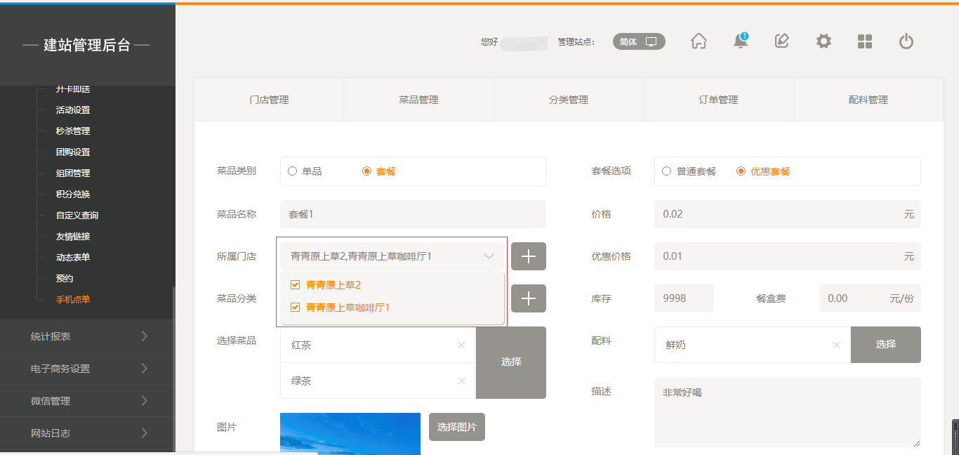 2.点击“菜品管理”添加菜品,添加菜品时有两种选项,一个是“单品”,另一个是“套餐”,当点击“套餐”时,我们选择之前添加好的单品进行组合即可;当添加菜品时,我们也可以给该菜品添加“口味”以及“配料”,同时我们也可以给该菜品进行“规格”设置,如“大杯”“小杯”等,在前端添加菜品时都会体现出来,填写完成后点击保存即可,如图所示: